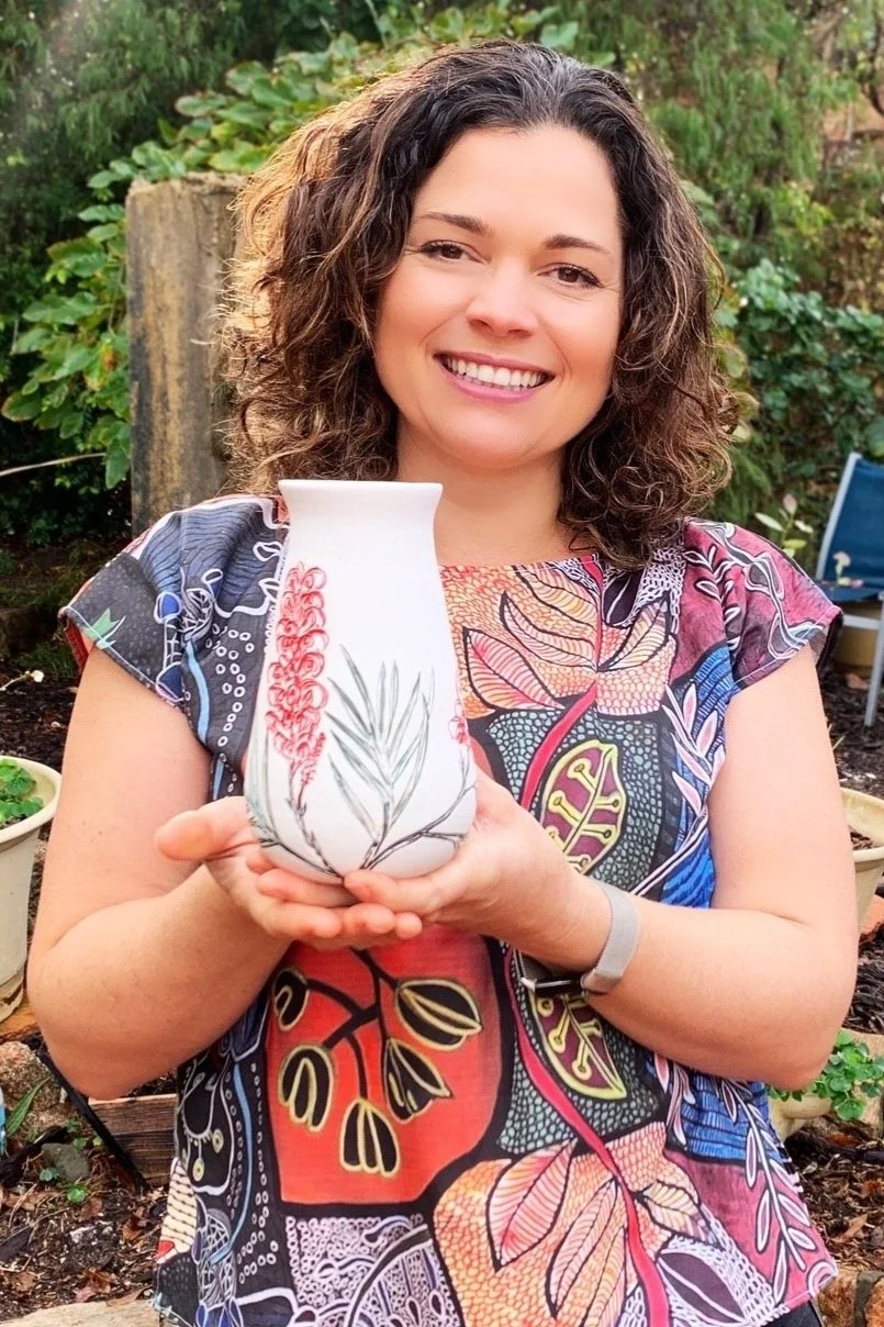Danica at her home studio in Wattle Grove, holding a custom vase featuring Grevillea flowers.