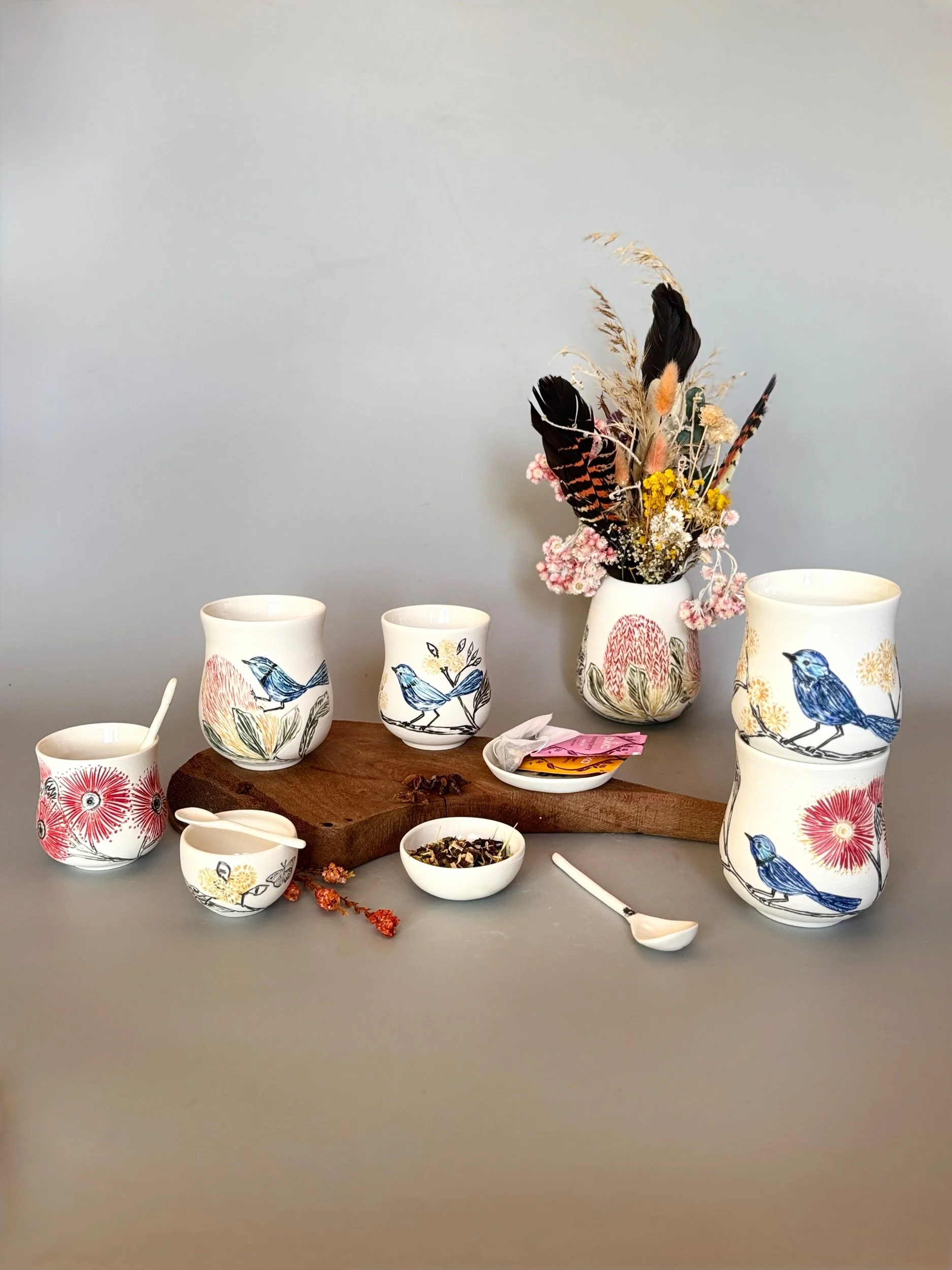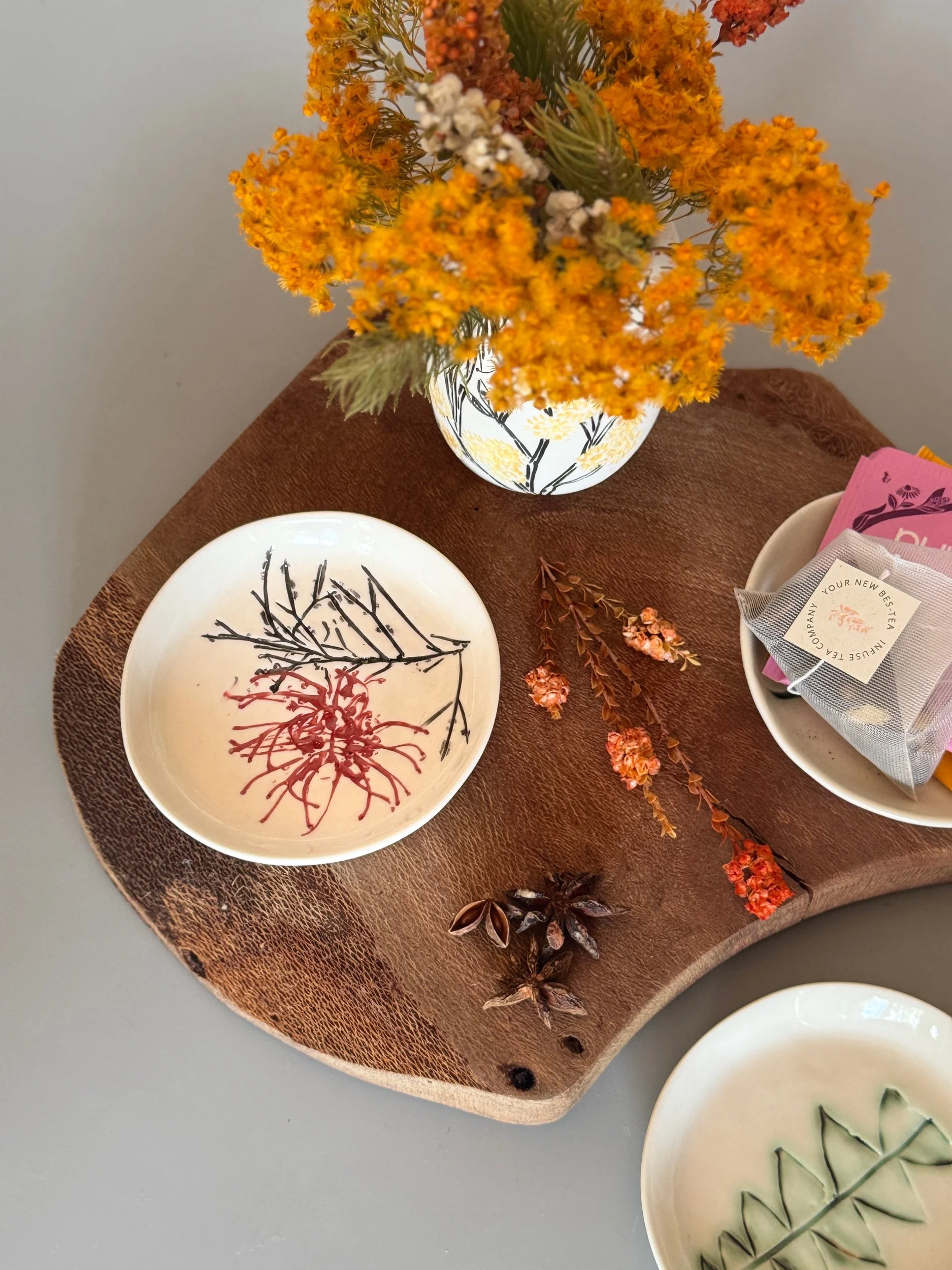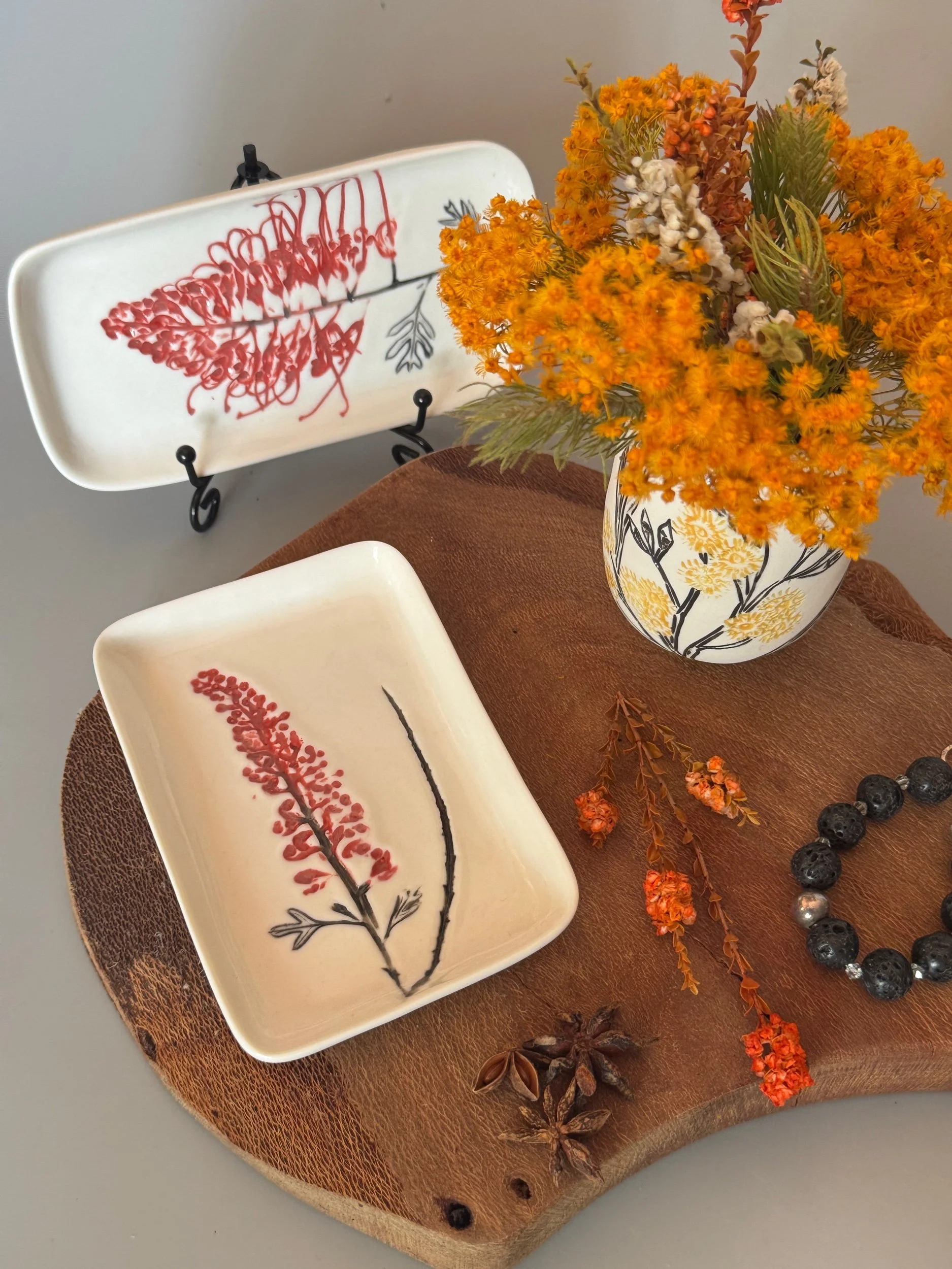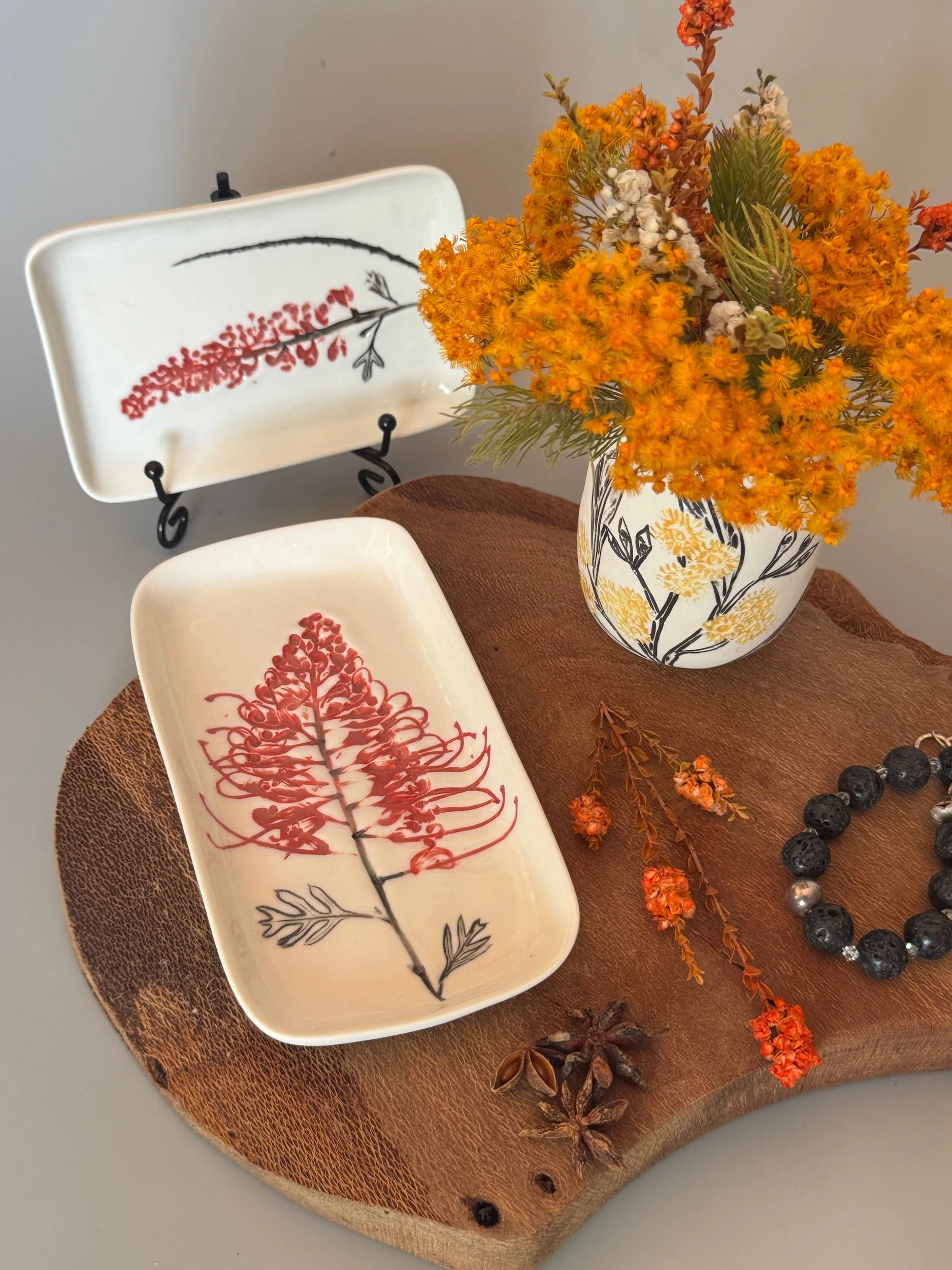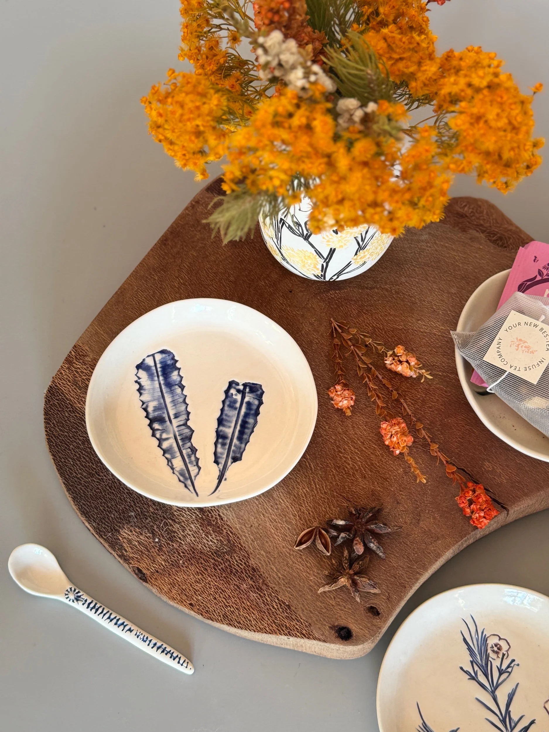 Tableware Categories: All Bespoke Pieces Custom Order Gift Voucher Homeware Tableware Workshops All / All Bespoke Pieces Custom Order Gift Voucher Homeware Tableware Workshops Quick View Splendid Fairy Wren Platters from $140.00 Sale Quick View Large Red Tail Black Cockatoo Serving Platter Sale Price: $252.00 Original Price: $280.00 Sold Out Quick View Red Tail Black Cockatoo Serving Platter Sale Price: $270.00 Original Price: $300.00 Sale Quick View Australian Ringneck - Sgraffito plates from $65.00 Quick View Australian Ringneck - Oval Platter and Bowls from $65.00 Quick View Carnaby's Black Cockatoo - Sgraffito plates from $65.00 Quick View Mug-Red Flowering Gum from $90.00 Quick View Mug- Botanical Mugs from $80.00 Quick View Mug- Wattle Sgraffito from $90.00 Quick View Mugs- Botanicals with birds from $80.00 Quick View Giant Spider Orchid Platters and Nibble bowl Sale Price: $220.00 Original Price: $295.00 Sale Quick View Large Donkey Orchid Serving Platter and Nibble bowl from $60.00 Sale Quick View Mini imprint plate from $35.00 Sale Quick View Eucalyptus Spice and Nibble Bowl with spoon $60.00 Quick View Salt or Pepper Spice Shaker Domes from $65.00 Quick View Mini Ring or Spice Bowl with Imprints from $13.00 Quick View Large Grevillea Serving Platter Sale Price: $250.00 Original Price: $280.00 Sale Quick View Imprint Rectangle Dishes from $45.00 Quick View Medium Pasta Bowl - Grevillea $95.00 Quick View Grevillea Plates from $50.00 Quick View Plates with Wattle imprints from $35.00 Quick View Plates with Kangaroo Paw imprints from $35.00 Quick View Plates and Bowls Banksia menziesii design from $50.00 Quick View Large Wattle Serving Platter Sale Price: $250.00 Original Price: $280.00 Sale Quick View Olive Spoons from $25.00 Quick View Spoons from $15.00 Quick View Cockatoo feather platter $180.00 Sold Out Quick View Carnaby's Black Cockatoo Platter - Small $180.00 Sold Out Quick View Mug- Banksia Sgraffito from $90.00 Sold Out