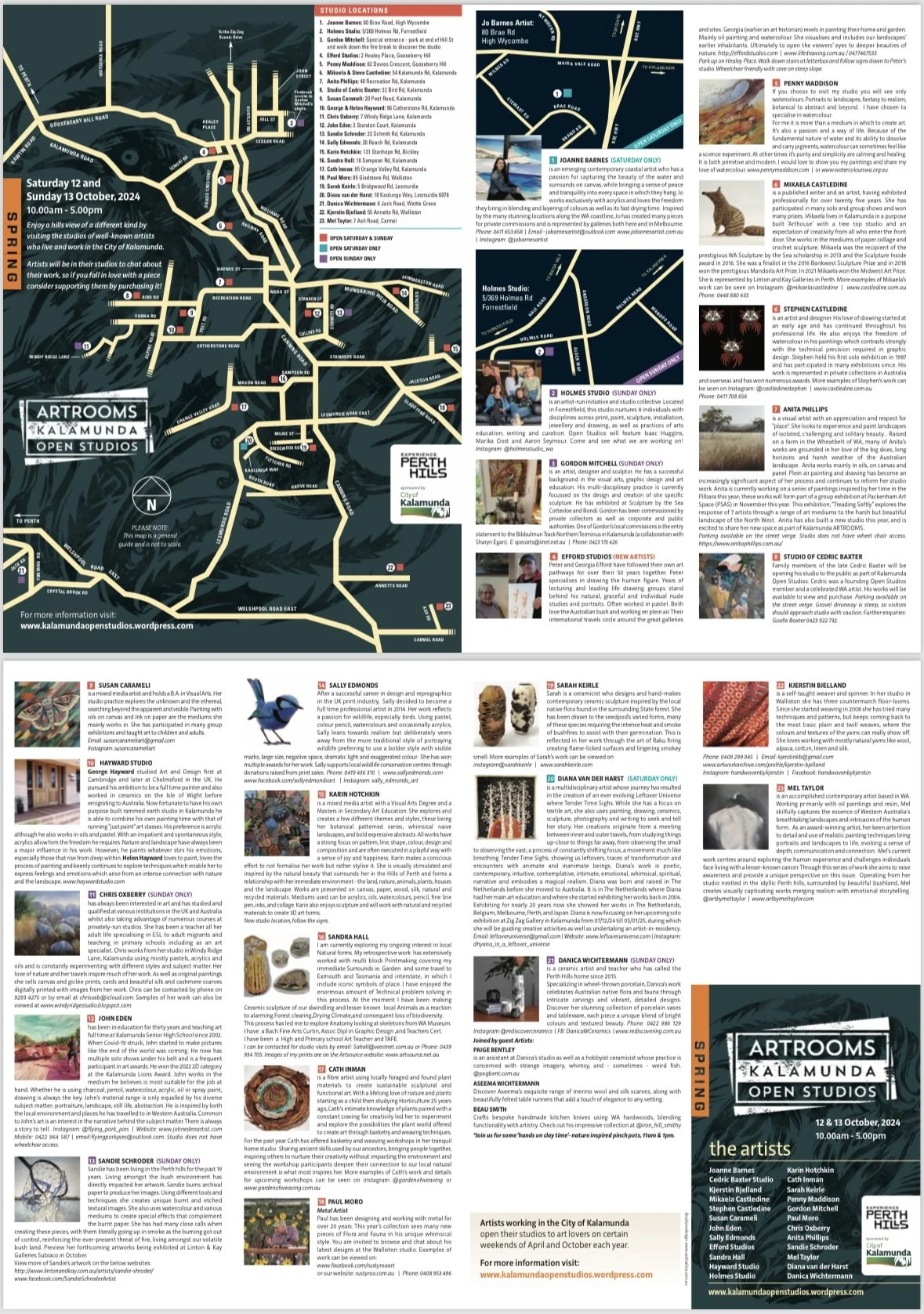 Maps will be available from Kalamunda Open Studios Website or collected from the Zig Zag Cultural Centre, Shire Offices and many local businesses.